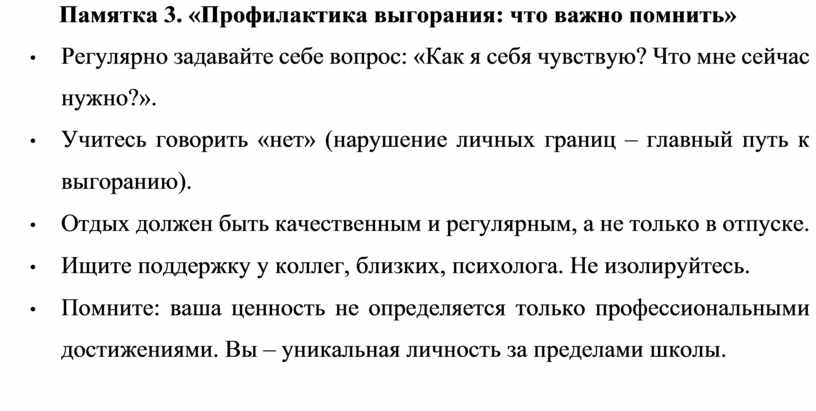 Памятка 3. «Профилактика выгорания: что важно помнить»