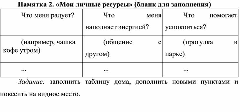 Задание: заполнить таблицу дома, дополнить новыми пунктами и повесить на видное место.