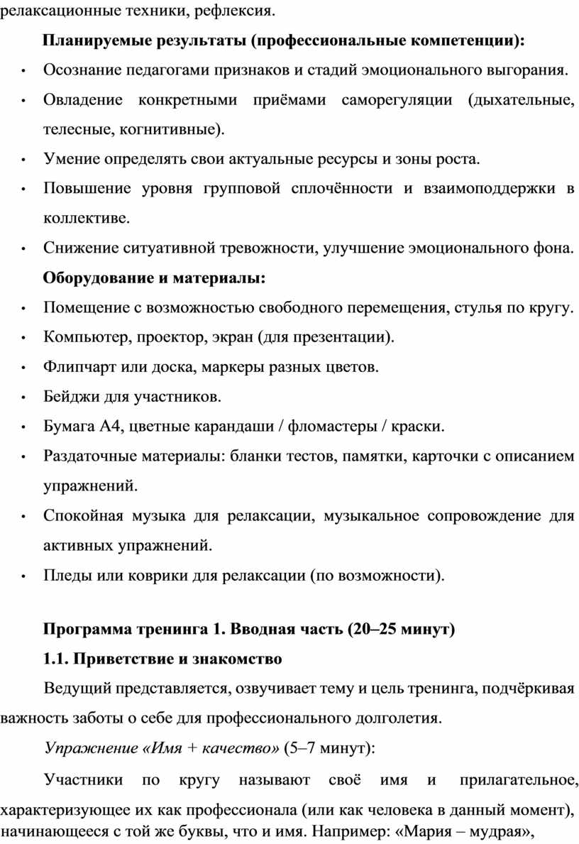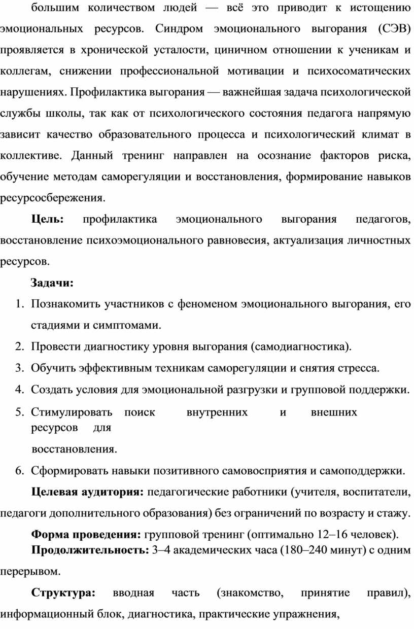 Актуальность. Профессия педагога относится к числу наиболее стрессогенных. Высокая эмоциональная нагрузка, необходимость постоянно находиться «в форме», решать конфликтные ситуации, взаимодействовать с большим количеством людей — всё это приводит к истощению эмоциональных ресурсов. Синдром эмоционального выгорания (СЭВ) проявляется в хронической усталости, циничном отношении к ученикам и коллегам, снижении профессиональной мотивации и психосоматических нарушениях. Профилактика выгорания — важнейшая задача психологической службы школы, так как от психологического состояния педагога напрямую зависит качество образовательного процесса и психологический климат в коллективе. Данный тренинг направлен на осознание факторов риска, обучение методам саморегуляции и восстановления, формирование навыков ресурсосбережения.
