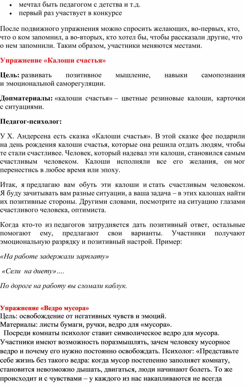 Когда кто-то из педагогов затрудняется дать позитивный ответ, остальные помогают ему, предлагают свои варианты. Участники получают эмоциональную разрядку и позитивный настрой. Пример: