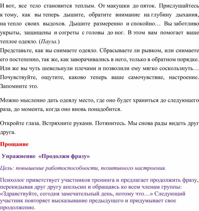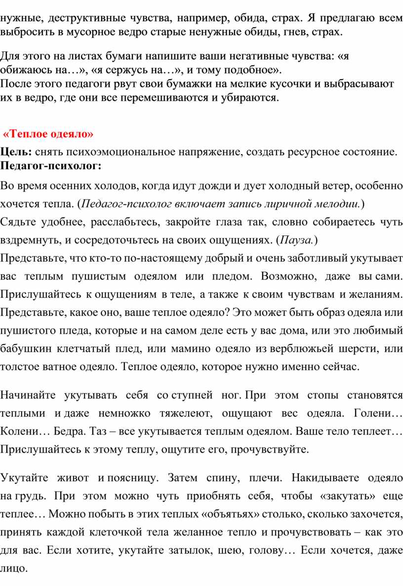 Цель: снять психоэмоциональное напряжение, создать ресурсное состояние.
