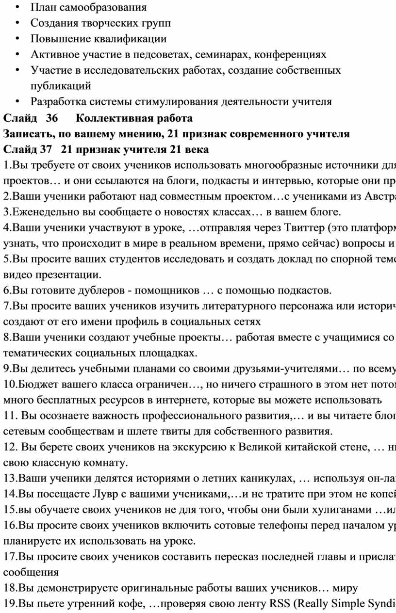 Слайд 36 Коллективная работа Записать, по вашему мнению, 21 признак современного учителя Слайд 37 21 признак учителя 21 века 1.Вы