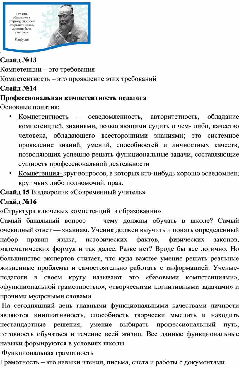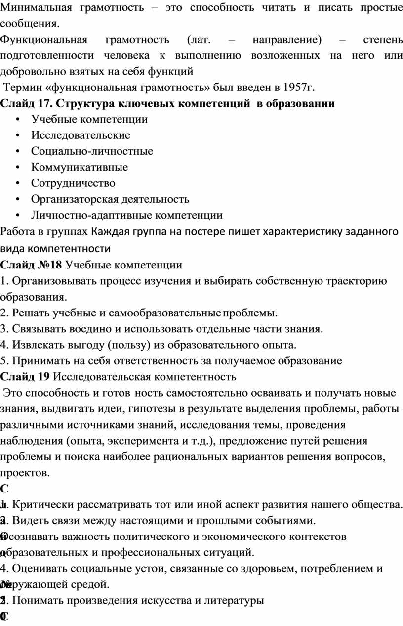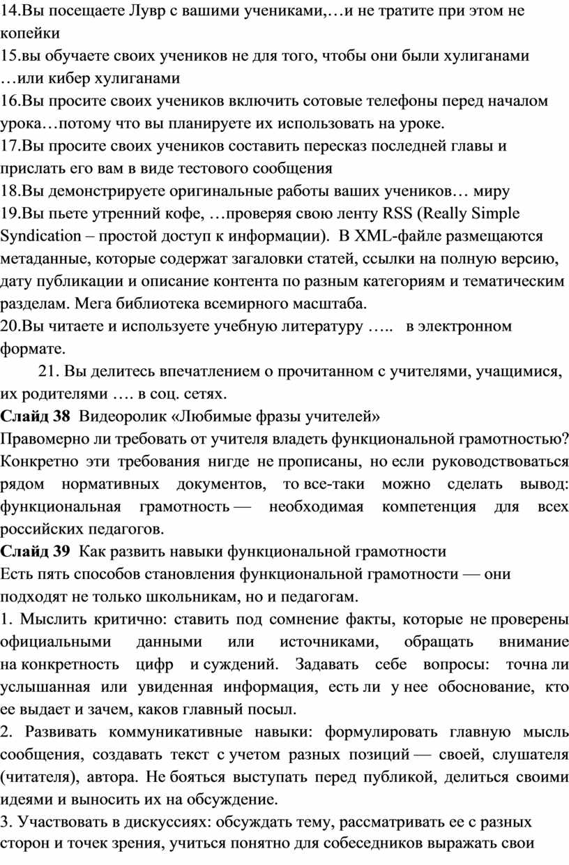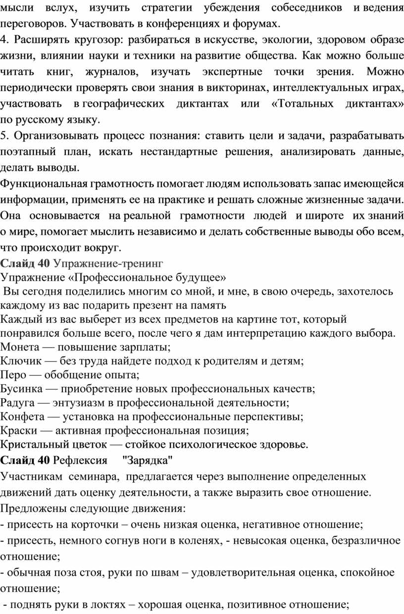 которые они провели, используя скайп. 21. Вы делитесь впечатлением о прочитанном с учителями, учащимися, их родителями …. в соц. сетях. Слайд 38 Видеоролик «Любимые фразы учителей» Правомерно ли требовать от учителя владеть функциональной грамотностью? Конкретно эти требования нигде не прописаны, но если руководствоваться рядом нормативных документов, то все-таки можно сделать вывод: функциональная грамотность — необходимая компетенция для всех российских педагогов. Слайд 39 Как развить навыки функциональной грамотности Есть пять способов становления функциональной грамотности — они подходят не только школьникам, но и педагогам. 1. Мыслить критично: ставить под сомнение факты, которые не проверены официальными данными или источниками, обращать внимание на конкретность цифр и суждений. Задавать себе вопросы: точна ли услышанная или увиденная информация, есть ли у нее обоснование, кто ее выдает и зачем, каков главный посыл. 2. Развивать коммуникативные навыки: формулировать главную мысль сообщения, создавать текст с учетом разных позиций — своей, слушателя (читателя), автора. Не бояться выступать перед публикой, делиться своими идеями и выносить их на обсуждение. 3. Участвовать в дискуссиях: обсуждать тему, рассматривать ее с разных сторон и точек зрения, учиться понятно для собеседников выражать свои мысли вслух, изучить стратегии убеждения собеседников и ведения переговоров. Участвовать в конференциях и форумах. 4. Расширять кругозор: разбираться в искусстве, экологии, здоровом образе жизни, влиянии науки и техники на развитие общества. Как можно больше читать книг, журналов, изучать экспертные точки зрения. Можно периодически проверять свои знания в викторинах, интеллектуальных играх, участвовать в географических диктантах или «Тотальных диктантах» по русскому языку. 5. Организовывать процесс познания: ставить цели и задачи, разрабатывать поэтапный план, искать нестандартные решения, анализировать данные, делать выводы. Функциональная грамотность помогает людям использовать запас имеющейся информации, применять ее на практике и решать сложные жизненные задачи. Она основывается на реальной грамотности людей и широте их знаний о мире, помогает мыслить независимо и делать собственные выводы обо всем, что происходит вокруг. Слайд 40 Упражнение-тренинг Упражнение «Профессиональное будущее» Вы сегодня поделились многим со мной, и мне, в свою очередь, захотелось каждому из вас подарить презент на память Каждый из вас выберет из всех предметов на картине тот, который понравился больше всего, после чего я дам интерпретацию каждого выбора. Монета — повышение зарплаты; Ключик — без труда найдете подход к родителям и детям; Перо — обобщение опыта; Бусинка — приобретение новых профессиональных качеств; Радуга — энтузиазм в профессиональной деятельности; Конфета — установка на профессиональные перспективы; Краски — активная профессиональная позиция; Кристальный цветок — стойкое психологическое здоровье. Слайд 40 Рефлексия "Зарядка" Участникам семинара, предлагается через выполнение определенных движений дать оценку деятельности, а также выразить свое отношение. Предложены следующие движения: - присесть на корточки – очень низкая оценка, негативное отношение; - присесть, немного согнув ноги в коленях, - невысокая оцен