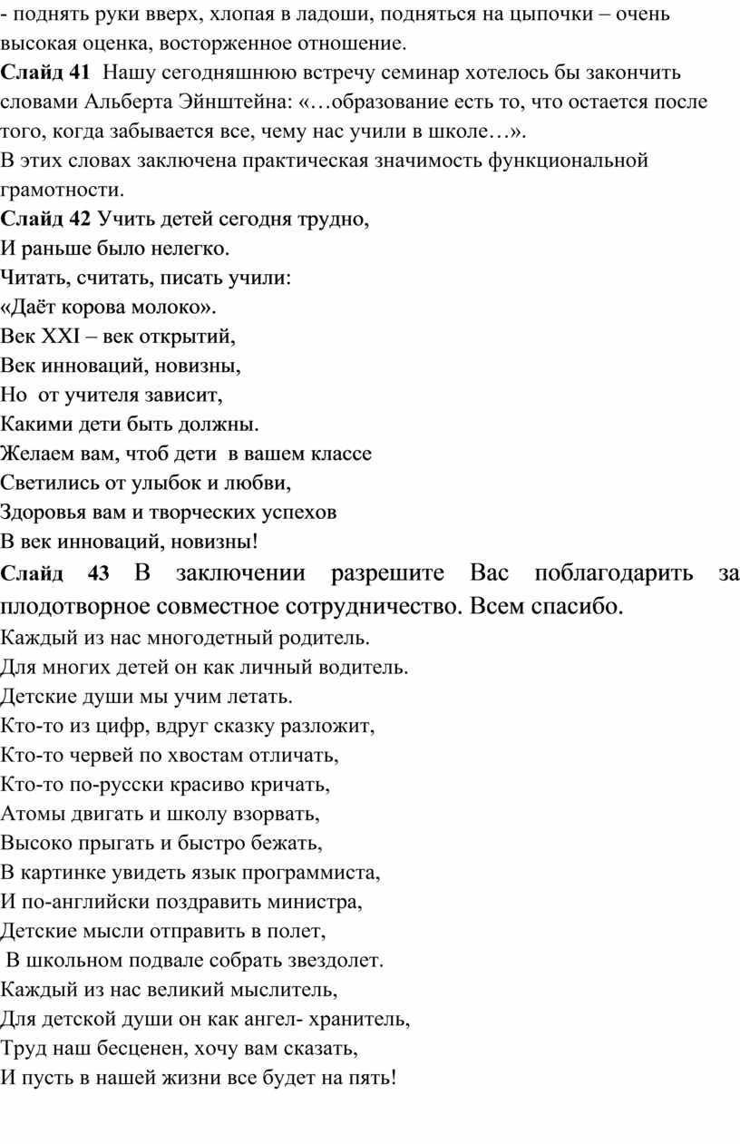 забывается все, чему нас учили в школе…». Слайд 42 Учить детей сегодня трудно, И раньше было нелегко. Читать, считать, писать учили: «Даёт корова молоко». Век XXI – век открытий, Век инноваций, новизны, Но от учителя зависит, Какими дети быть должны. Желаем вам, чтоб дети в вашем классе Светились от улыбок и любви, Здоровья вам и творческих успехов В век инноваций, новизны! Слайд 43 В заключении разрешите Вас поблагодарить за плодотворное совместное сотрудничество. Всем спасибо. Каждый из нас многодетный родитель. Для многих детей он как личный водитель. Детские души мы учим летать. Кто-то из цифр, вдруг сказку разложит, Кто-то червей по хвостам отличать, Кто-то по-русски красиво кричать, Атомы двигать и школу взорвать, Высоко прыгать и быстро бежать, В картинке увидеть язык программиста, И по-английски поздравить министра, Детские мысли отправить в полет, В школьном подвале собрать звездолет. Каждый из нас великий мыслитель, Для детской души он как ангел- хранитель, Труд наш бесценен, хочу вам сказать, И пусть в нашей жизни все будет на пять!