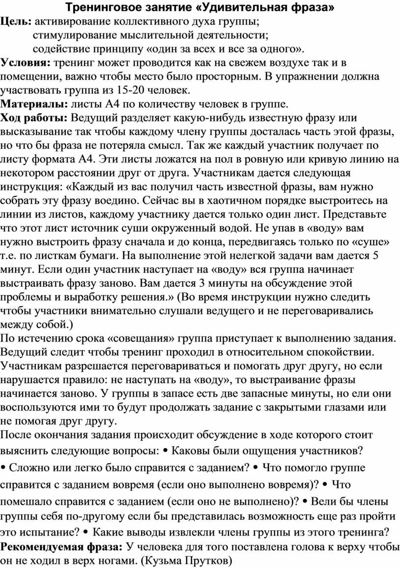 Ход работы: Ведущий разделяет какую-нибудь известную фразу или высказывание так чтобы каждому члену группы досталась часть этой фразы, но что бы фраза не потеряла смысл. Так же каждый участник получает по листу формата А4. Эти листы ложатся на пол в ровную или кривую линию на некотором расстоянии друг от друга. Участникам дается следующая инструкция: «Каждый из вас получил часть известной фразы, вам нужно собрать эту фразу воедино. Сейчас вы в хаотичном порядке выстроитесь на линии из листов, каждому участнику дается только один лист. Представьте что этот лист источник суши окруженный водой. Не упав в «воду» вам нужно выстроить фразу сначала и до конца, передвигаясь только по «суше» т.е. по листкам бумаги. На выполнение этой нелегкой задачи вам дается 5 минут. Если один участник наступает на «воду» вся группа начинает выстраивать фразу заново. Вам дается 3 минуты на обсуждение этой проблемы и выработку решения.» (Во время инструкции нужно следить чтобы участники внимательно слушали ведущего и не переговаривались между собой.)
