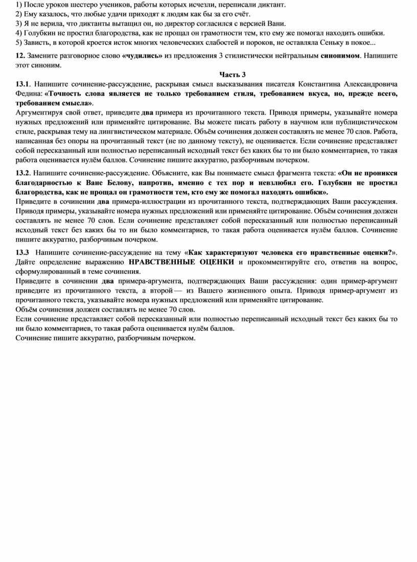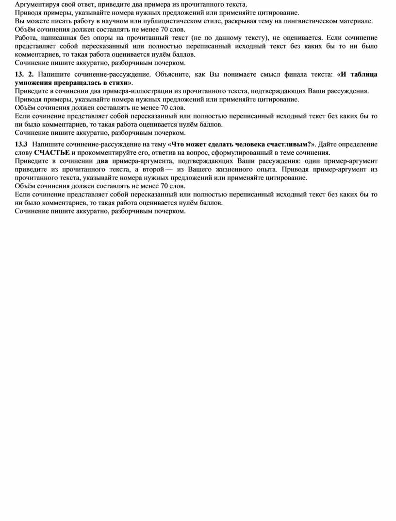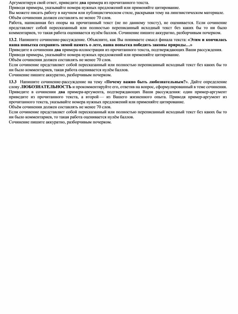 Работа, написанная без опоры на прочитанный текст (не по данному тексту), не оценивается. Если сочинение представляет собой пересказанный или полностью переписанный исходный текст без каких бы то ни было комментариев, то такая работа оценивается нулём баллов. Сочинение пишите аккуратно, разборчивым почерком.