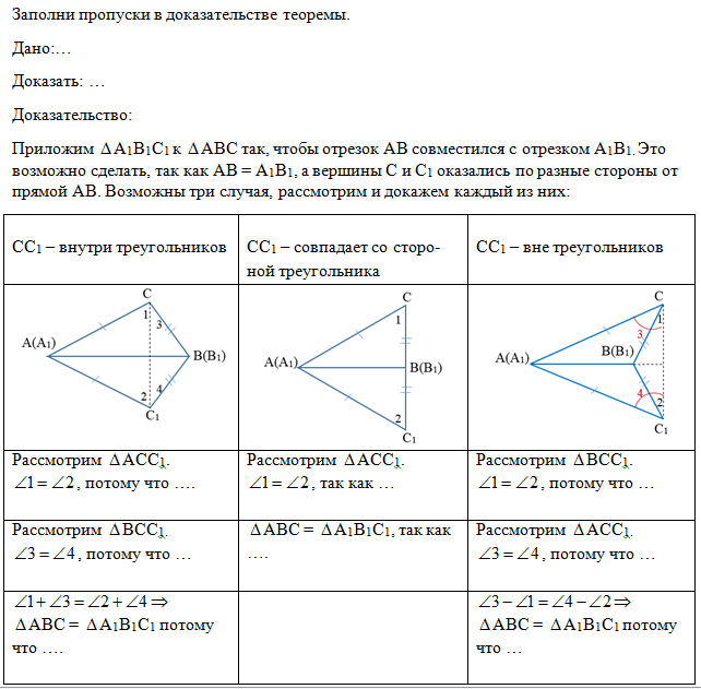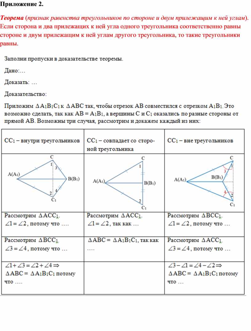 Теорема (признак равенства треугольников по стороне и двум прилежащим к ней углам). Если сторона и два прилежащих к ней угла одного треугольника соответственно равны стороне и двум прилежащим к ней углам другого треугольника, то такие треугольники равны.