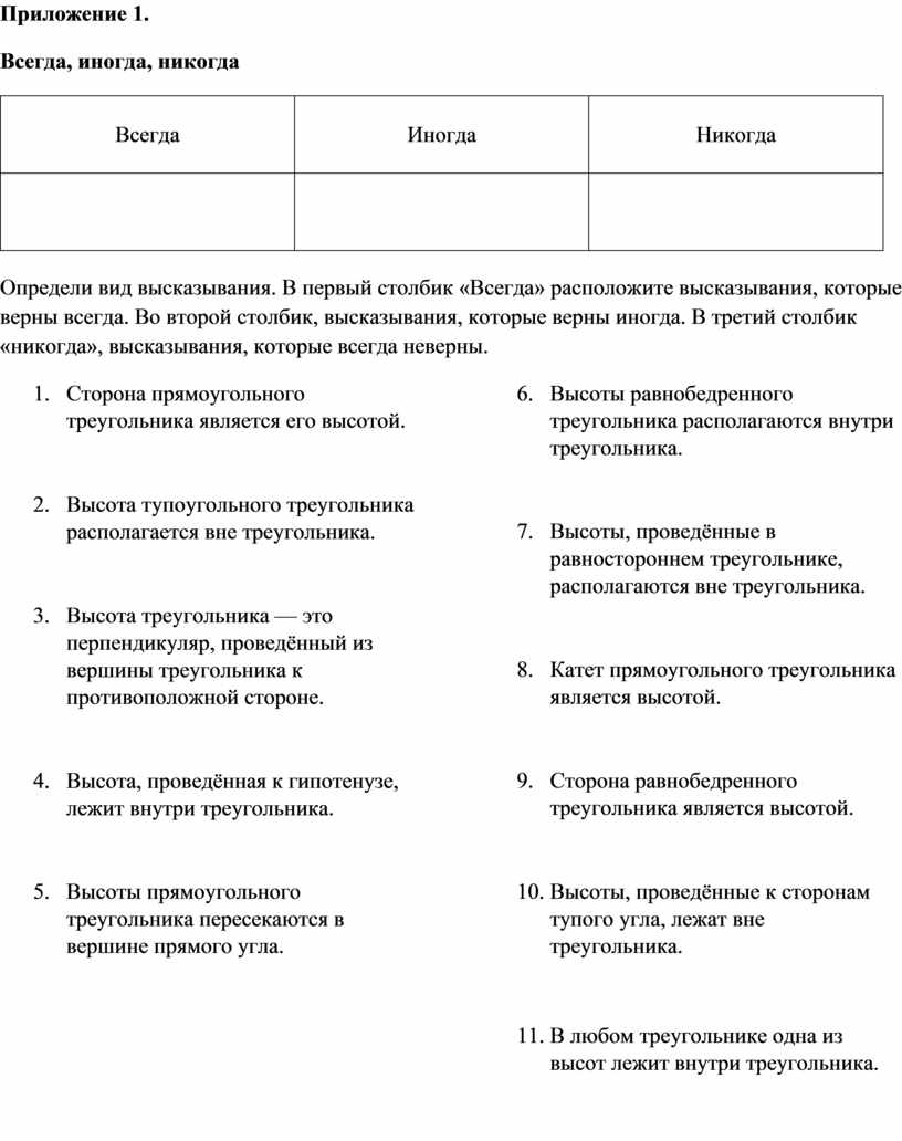 6. Высоты равнобедренного треугольника располагаются внутри треугольника.