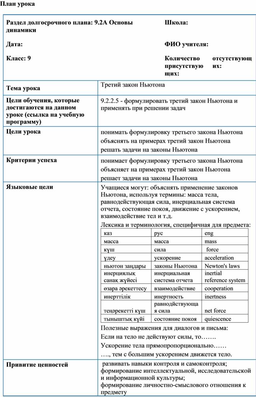 Учащиеся могут: объяснять применение законов Ньютона, используя термины: масса тела, равнодействующая сила, инерциальная система отчета, состояние покоя, движение с ускорением, взаимодействие тел и т.д. Лексика и терминология, специфичная для предмета: