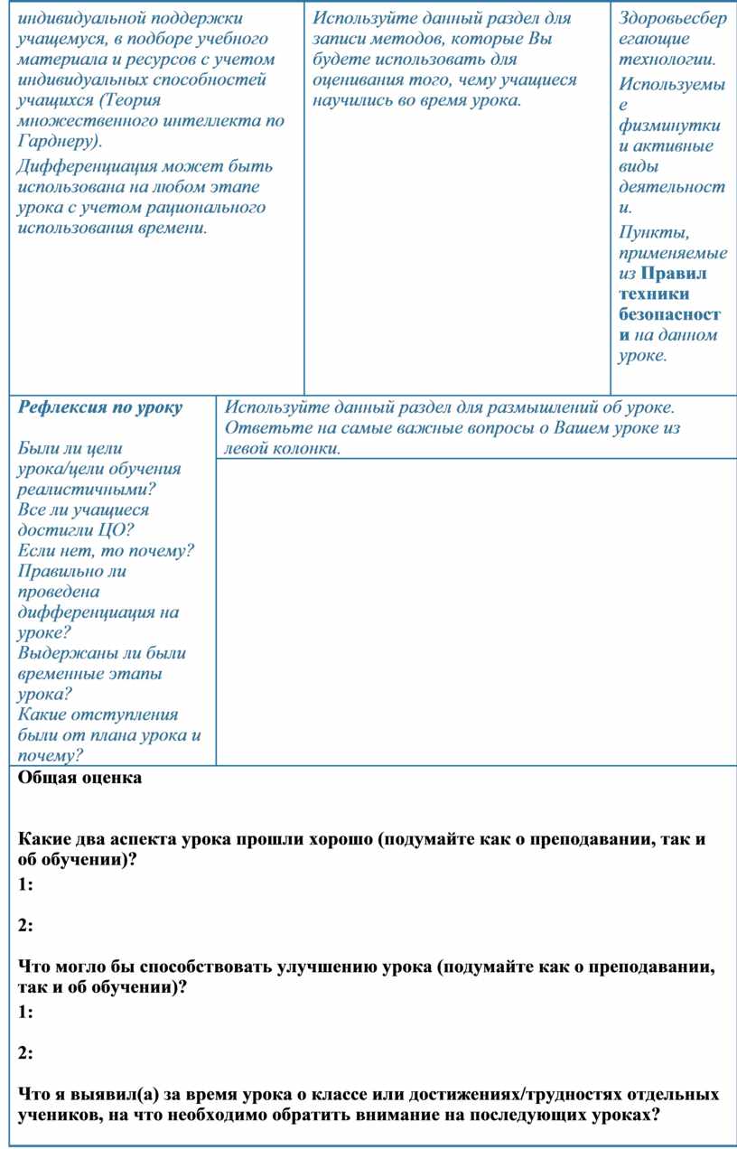 Были ли цели урока/цели обучения реалистичными? Все ли учащиеся достигли ЦО? Если нет, то почему? Правильно ли проведена дифференциация на уроке? Выдержаны ли были временные этапы урока? Какие отступления были от плана урока и почему? |