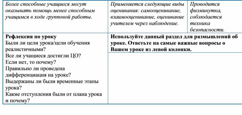 Используйте данный раздел для размышлений об уроке. Ответьте на самые важные вопросы о Вашем уроке из левой колонки. |