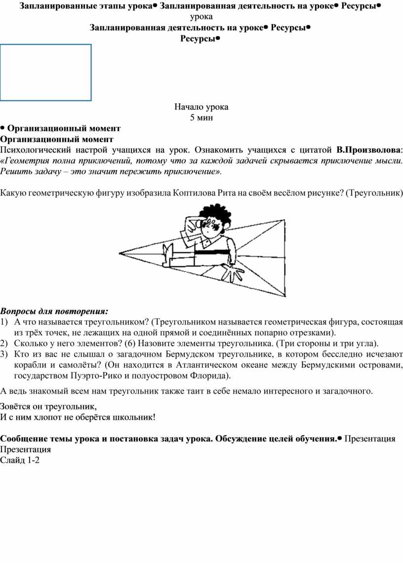 Организационный момент Психологический настрой учащихся на урок. Ознакомить учащихся с цитатой В.Произволова: «Геометрия полна приключений, потому что за каждой задачей скрывается приключение мысли. Решить задачу – это значит пережить приключение».