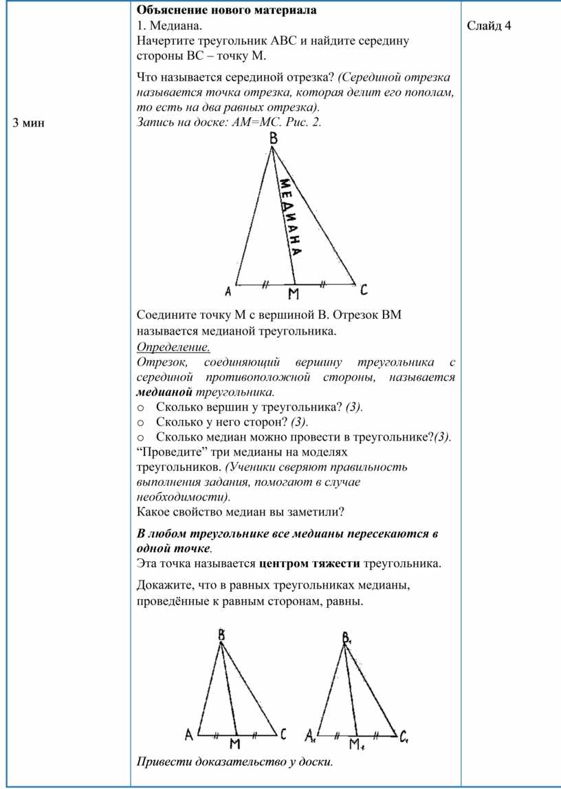 Соедините точку М с вершиной В. Отрезок ВМ называется медианой треугольника. Определение. Отрезок, соединяющий вершину треугольника с серединой противоположной стороны, называется медианой треугольника. o Сколько вершин у треугольника? (3). o Сколько у него сторон? (3). o Сколько медиан можно провести в треугольнике?(3). “Проведите” три медианы на моделях треугольников. (Ученики сверяют правильность выполнения задания, помогают в случае необходимости). Какое свойство медиан вы заметили? В любом треугольнике все медианы пересекаются в одной точке. Эта точка называется центром тяжести треугольника. Докажите, что в равных треугольниках медианы, проведённые к равным сторонам, равны.