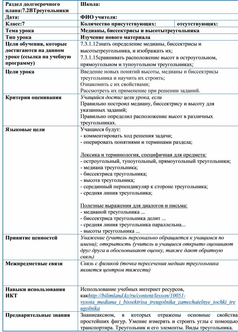 Использование учебных интернет ресурсов, какhttp://bilimland.kz/ru/content/lesson/10051-vysota_mediana_i_bissektrisa_treugolnika_zamechatelnye_tochki_treugolnika |