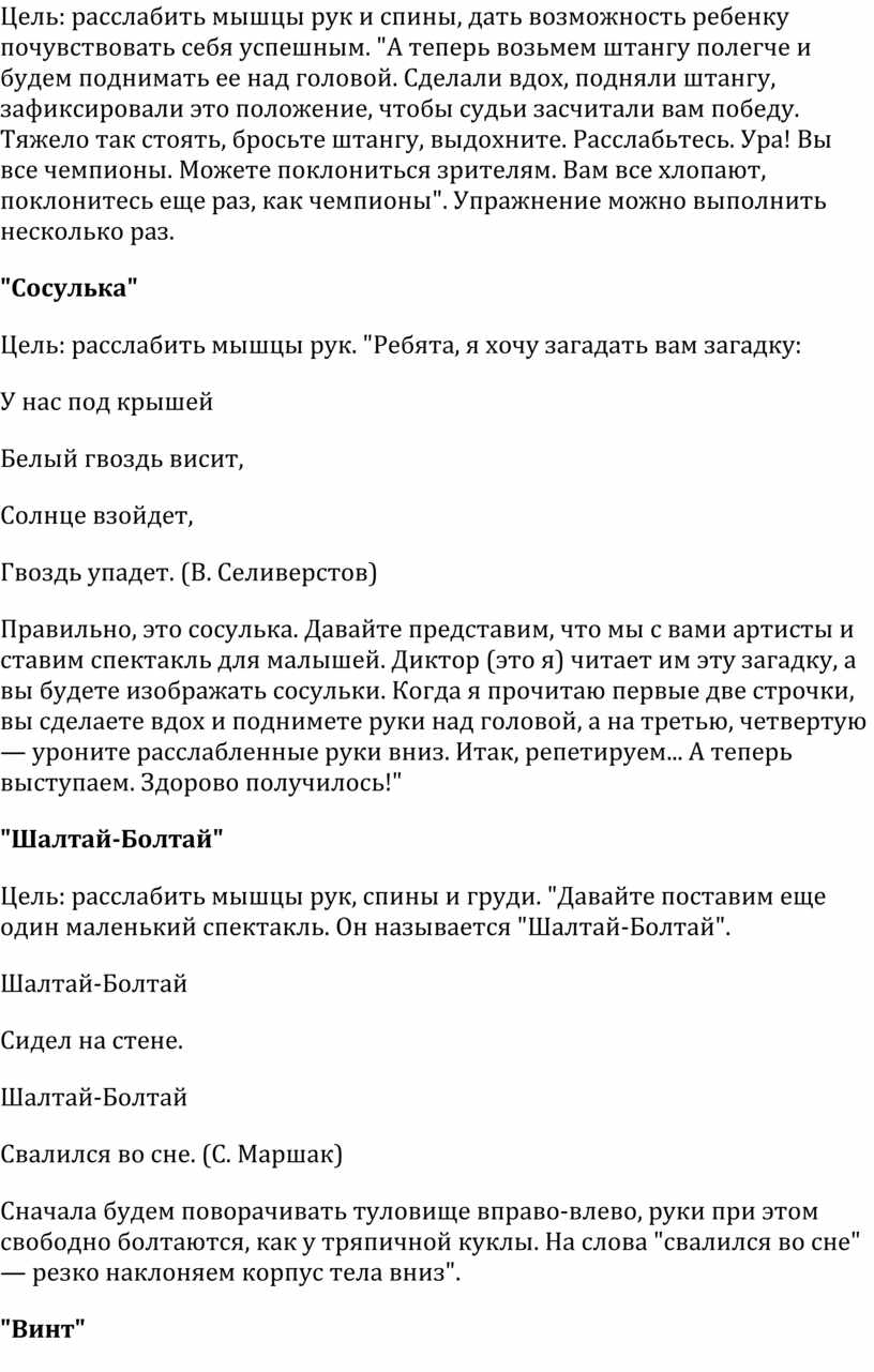 Цель: расслабить мышцы рук и спины, дать возможность ребенку почувствовать себя успешным. "А теперь возьмем штангу полегче и будем поднимать ее над головой. Сделали вдох, подняли штангу, зафиксировали это положение, чтобы судьи засчитали вам победу. Тяжело так стоять, бросьте штангу, выдохните. Расслабьтесь. Ура! Вы все чемпионы. Можете поклониться зрителям. Вам все хлопают, поклонитесь еще раз, как чемпионы". Упражнение можно выполнить несколько раз.