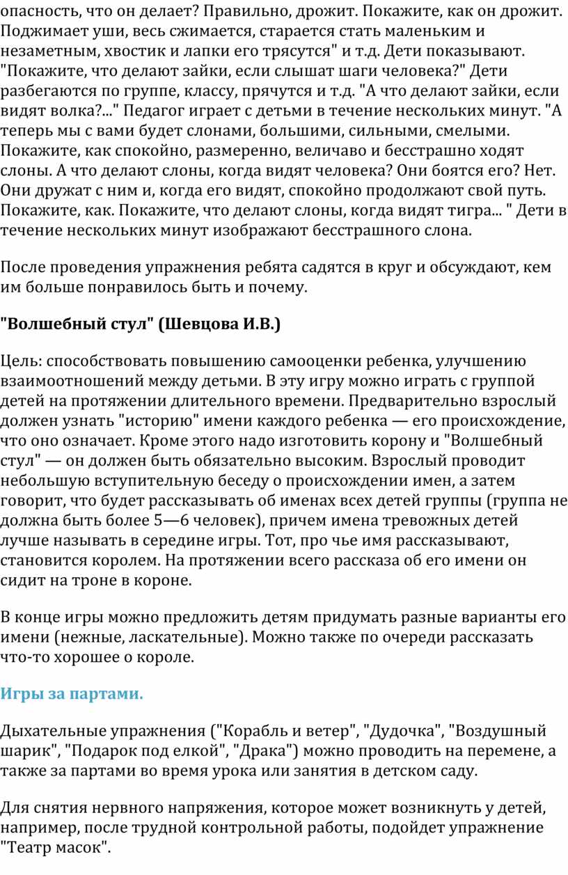 Игры "Зайки и слоны", "Волшебный стул" и др., способствующие повышению самооценки, можно проводить на любом этапе работы. Эффект от этих игр будет лишь в том случае, если они проводятся многократно и регулярно (каждый раз можно вносить элемент новизны).