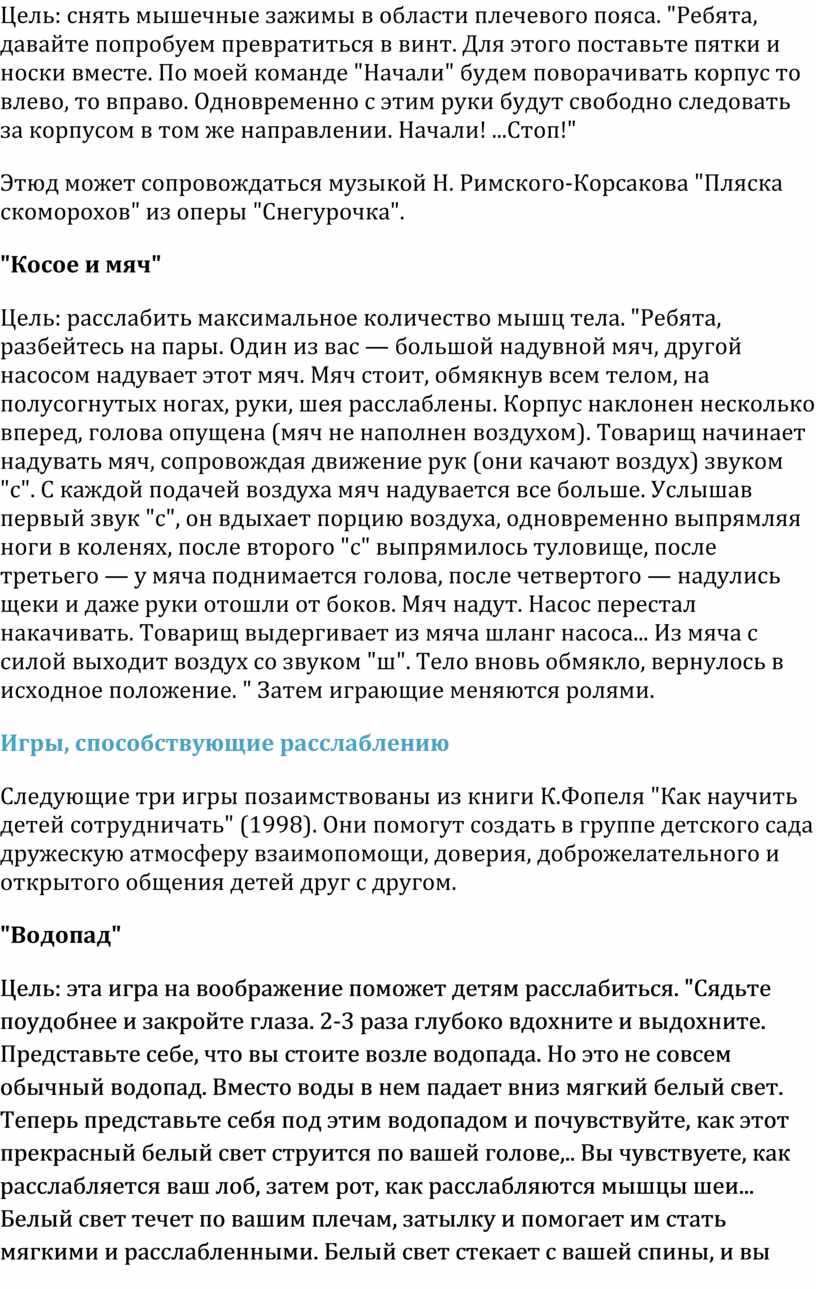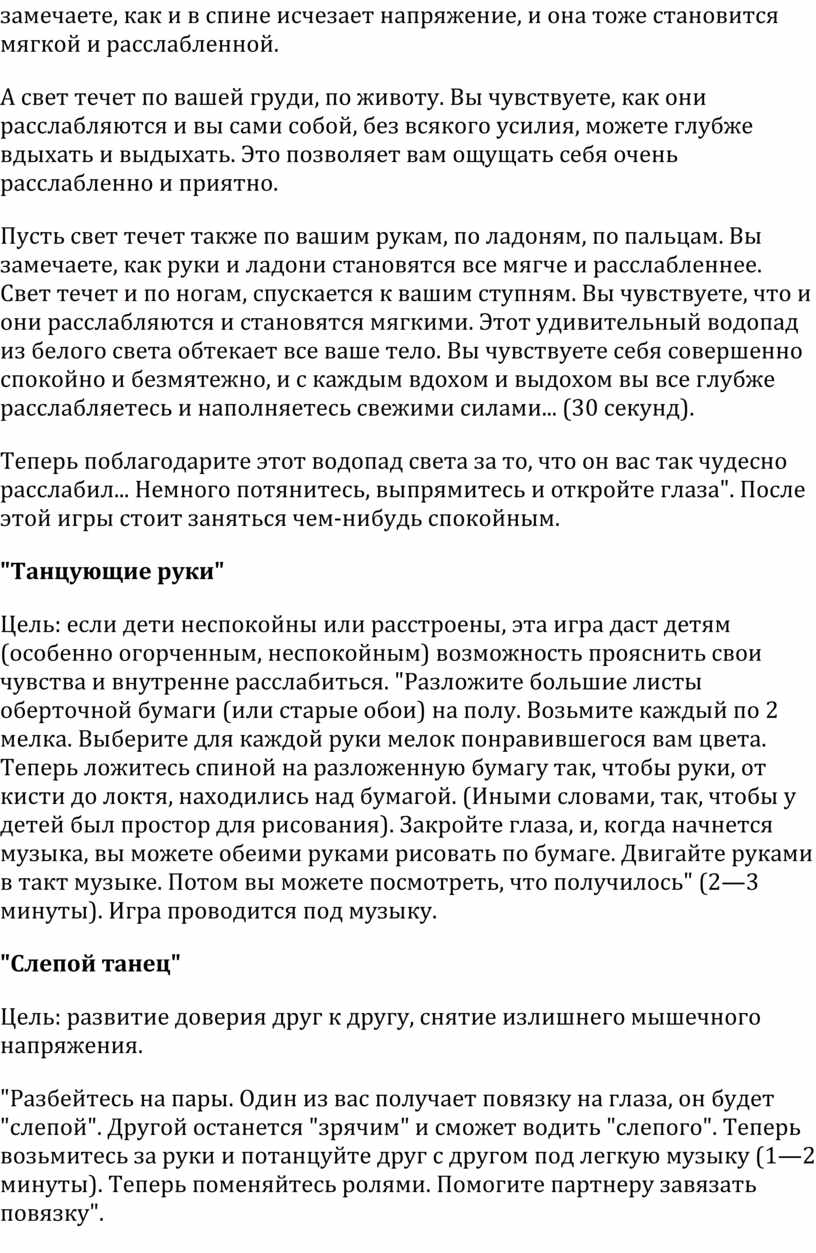 Цель: эта игра на воображение поможет детям расслабиться. "Сядьте поудобнее и закройте глаза. 2-3 раза глубоко вдохните и выдохните. Представьте себе, что вы стоите возле водопада. Но это не совсем обычный водопад. Вместо воды в нем падает вниз мягкий белый свет. Теперь представьте себя под этим водопадом и почувствуйте, как этот прекрасный белый свет струится по вашей голове,.. Вы чувствуете, как расслабляется ваш лоб, затем рот, как расслабляются мышцы шеи... Белый свет течет по вашим плечам, затылку и помогает им стать мягкими и расслабленными. Белый свет стекает с вашей спины, и вы замечаете, как и в спине исчезает напряжение, и она тоже становится мягкой и расслабленной.