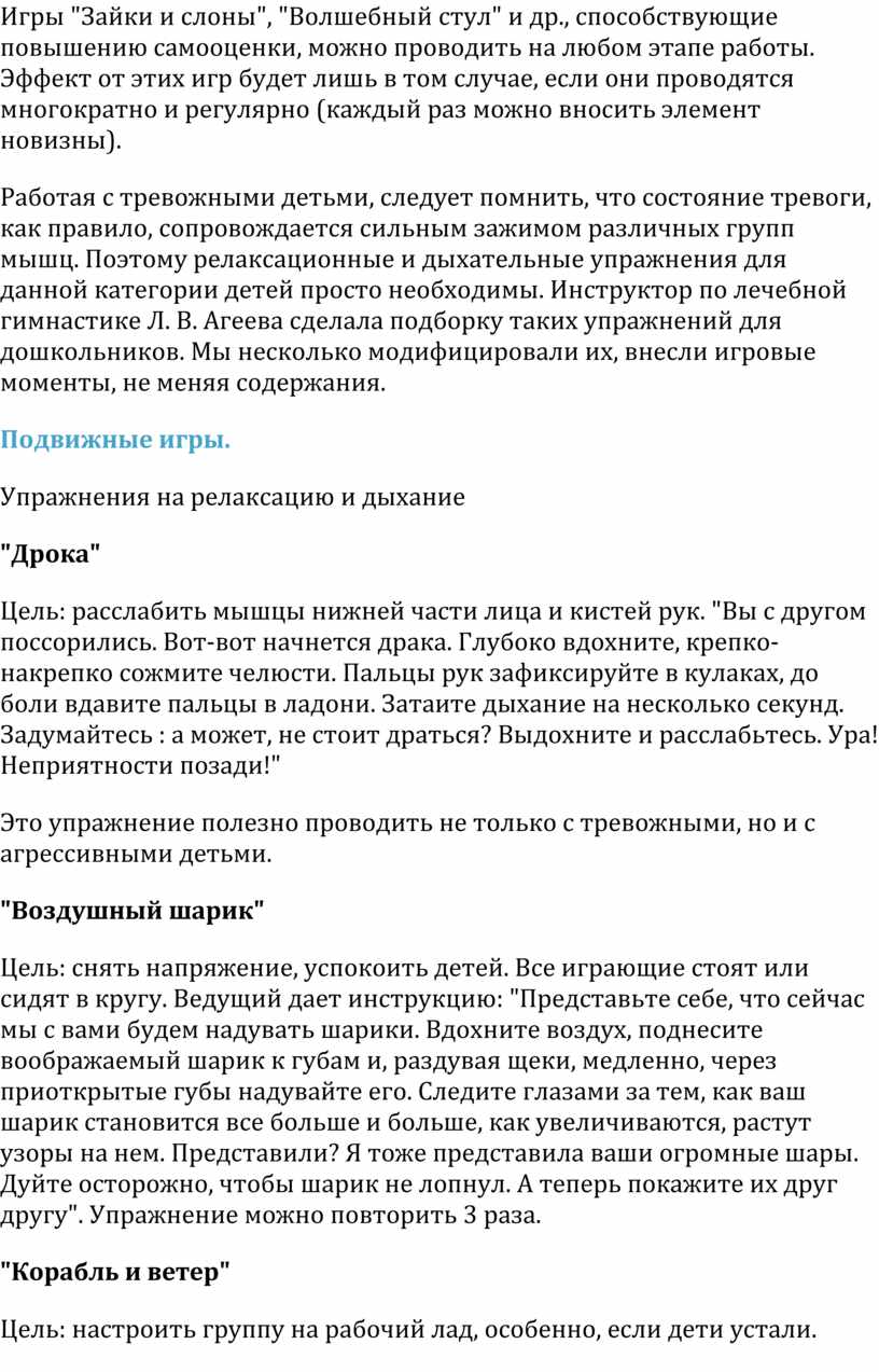 Работая с тревожными детьми, следует помнить, что состояние тревоги, как правило, сопровождается сильным зажимом различных групп мышц. Поэтому релаксационные и дыхательные упражнения для данной категории детей просто необходимы. Инструктор по лечебной гимнастике Л. В. Агеева сделала подборку таких упражнений для дошкольников. Мы несколько модифицировали их, внесли игровые моменты, не меняя содержания.