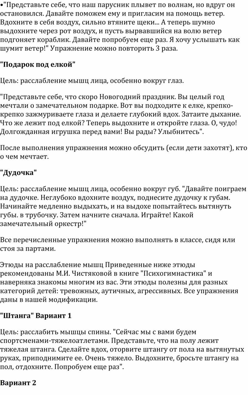 Этюды на расслабление мышц Приведенные ниже этюды рекомендованы М.И. Чистяковой в книге "Психогимнастика" и наверняка знакомы многим из вас. Эти этюды полезны для разных категорий детей: тревожных, аутичных, агрессивных. Все упражнения даны в нашей модификации.