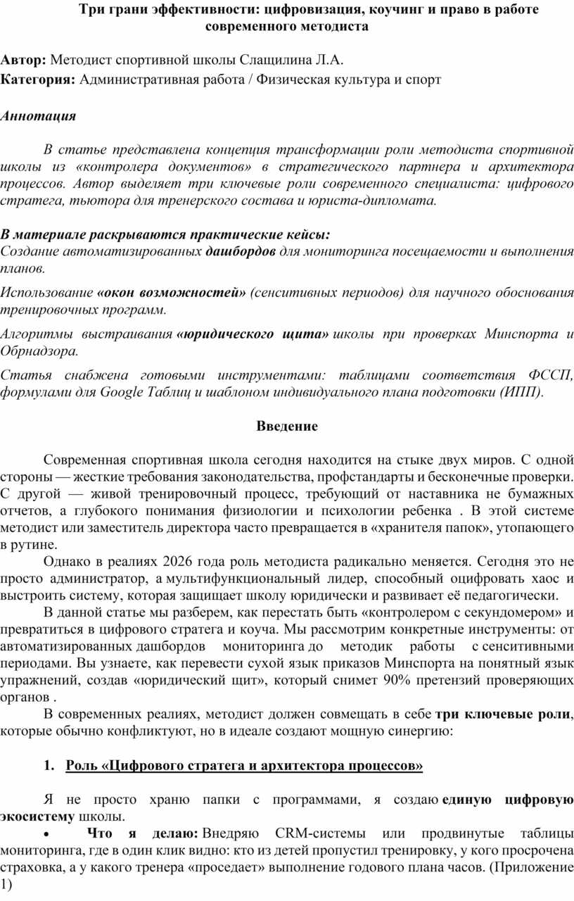 В статье представлена концепция трансформации роли методиста спортивной школы из «контролера документов» в стратегического партнера и архитектора процессов. Автор выделяет три ключевые роли современного специалиста: цифрового стратега, тьютора для тренерского состава и юриста-дипломата.