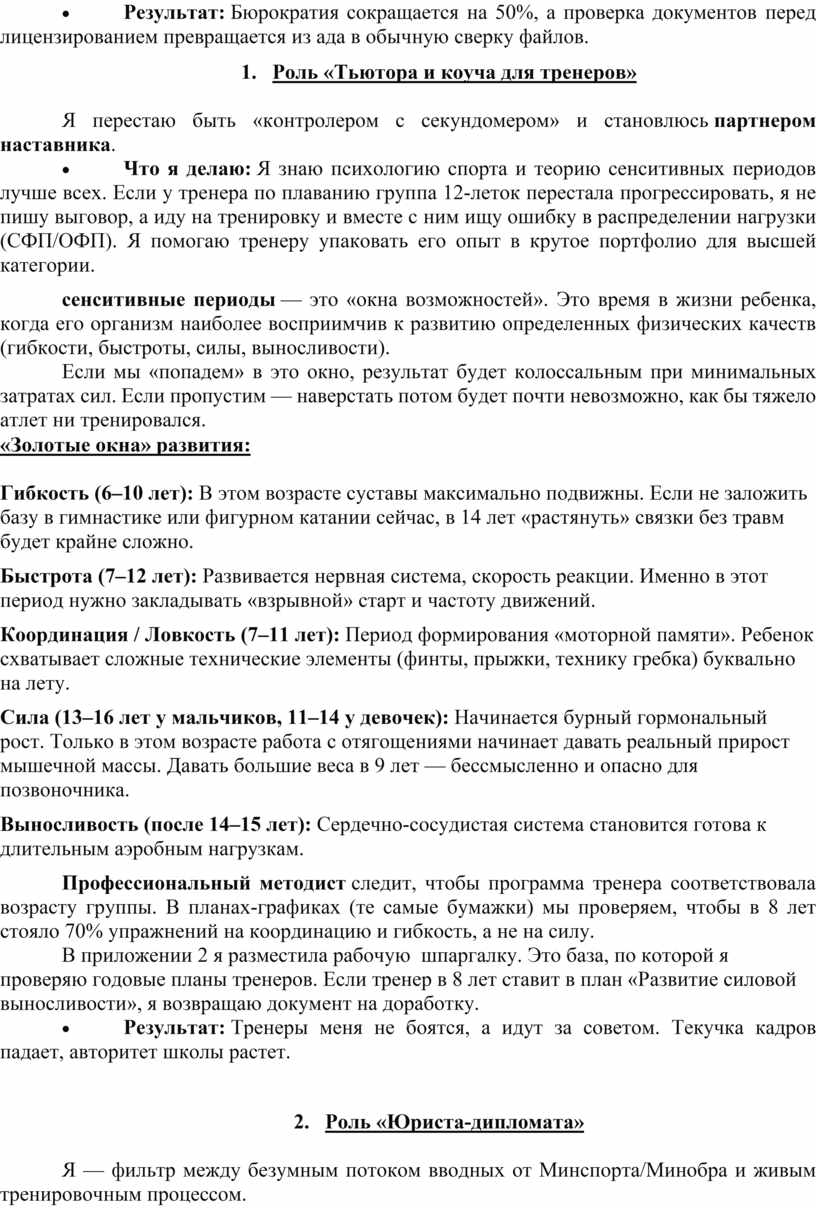 · Что я делаю: Я знаю психологию спорта и теорию сенситивных периодов лучше всех. Если у тренера по плаванию группа 12-леток перестала прогрессировать, я не пишу выговор, а иду на тренировку и вместе с ним ищу ошибку в распределении нагрузки (СФП/ОФП). Я помогаю тренеру упаковать его опыт в крутое портфолио для высшей категории.