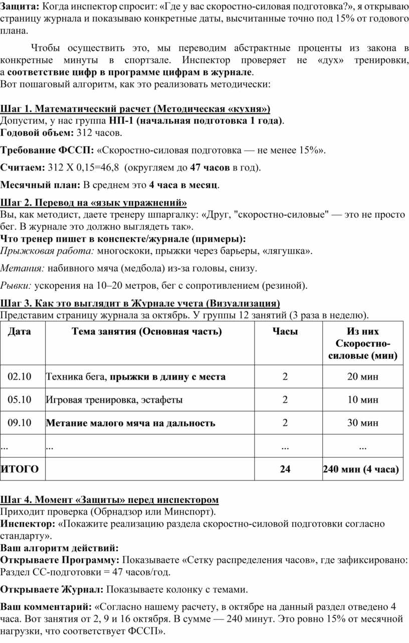 · Защита: Когда инспектор спросит: «Где у вас скоростно-силовая подготовка?», я открываю страницу журнала и показываю конкретные даты, высчитанные точно под 15% от годового плана.