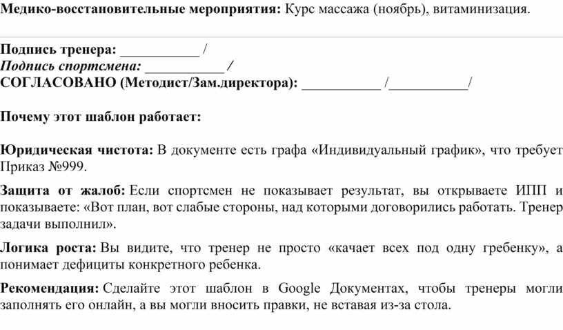 2. Защита от жалоб: Если спортсмен не показывает результат, вы открываете ИПП и показываете: «Вот план, вот слабые стороны, над которыми договорились работать. Тренер задачи выполнил».