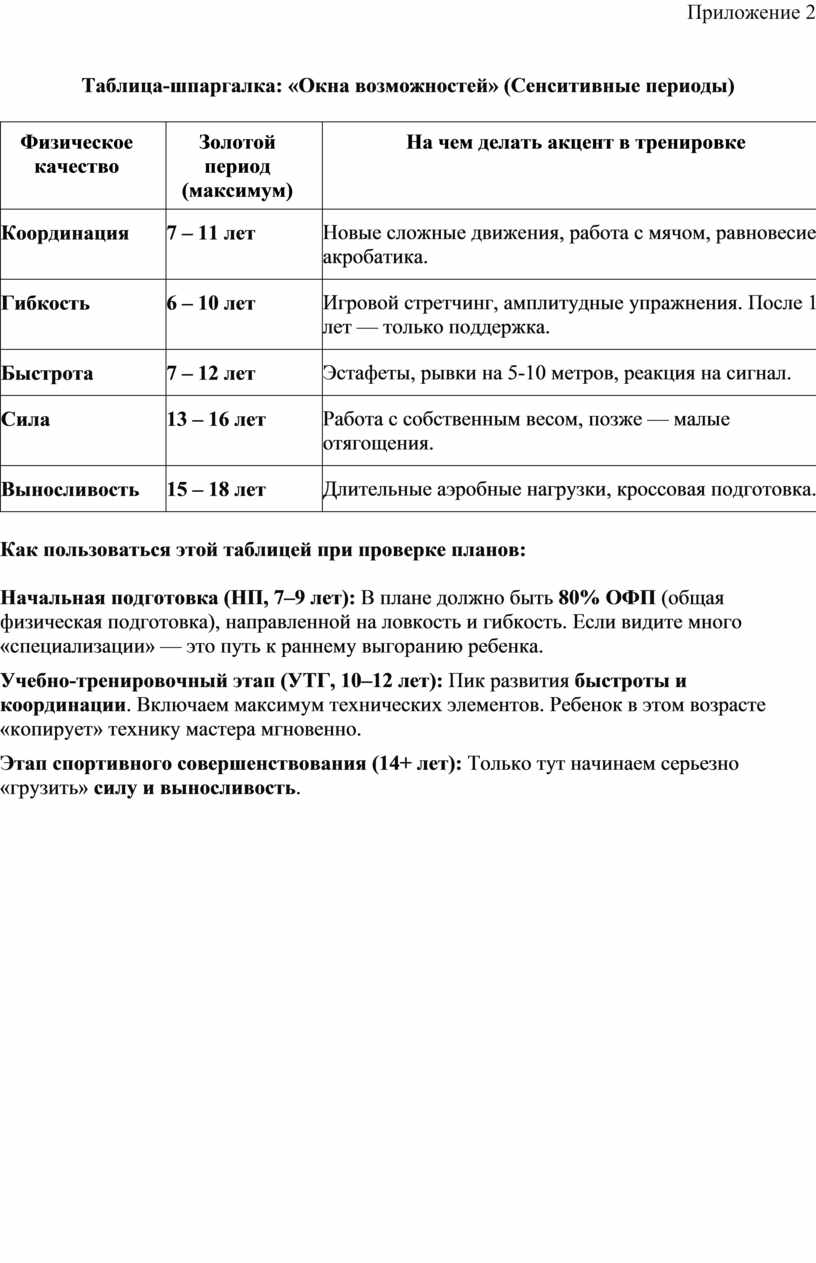 В приложении 2 я разместила рабочую шпаргалку. Это база, по которой я проверяю годовые планы тренеров. Если тренер в 8 лет ставит в план «Развитие силовой выносливости», я возвращаю документ на доработку.