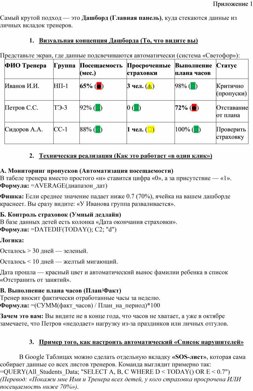 · Что я делаю: Внедряю CRM-системы или продвинутые таблицы мониторинга, где в один клик видно: кто из детей пропустил тренировку, у кого просрочена страховка, а у какого тренера «проседает» выполнение годового плана часов. (Приложение 1)