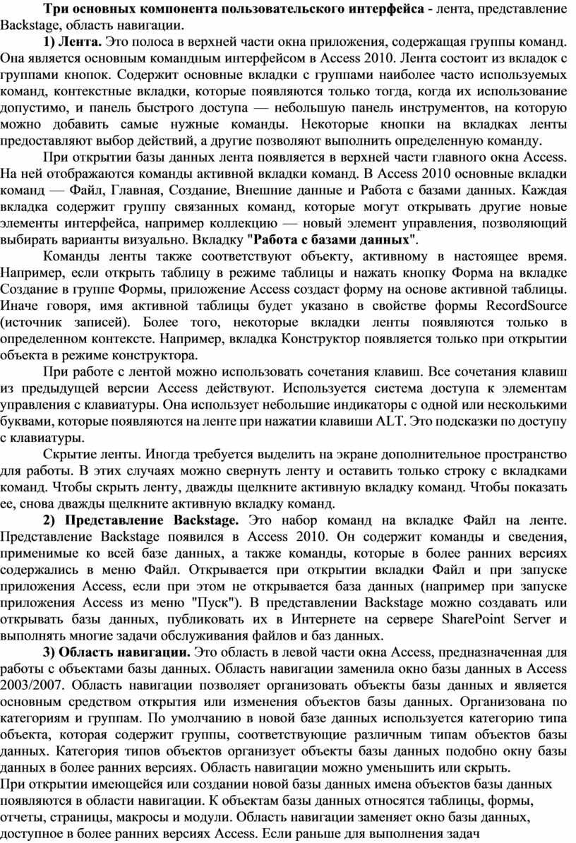 2) Представление Backstage. Это набор команд на вкладке Файл на ленте. Представление Backstage появился в Access 2010. Он содержит команды и сведения, применимые ко всей базе данных, а также команды, которые в более ранних версиях содержались в меню Файл. Открывается при открытии вкладки Файл и при запуске приложения Access, если при этом не открывается база данных (например при запуске приложения Access из меню "Пуск"). В представлении Backstage можно создавать или открывать базы данных, публиковать их в Интернете на сервере SharePoint Server и выполнять многие задачи обслуживания файлов и баз данных.