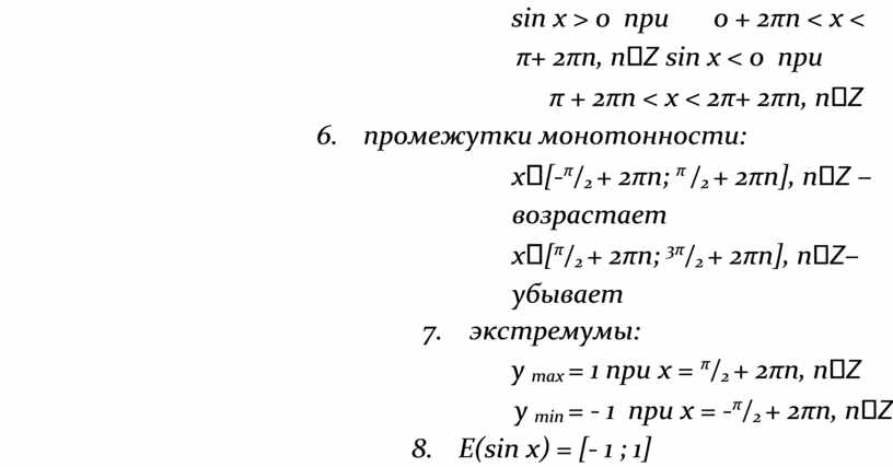 4. sin x = 0 при х = πn, nZ (нули функции) 5. промежутки знакопостоянства: