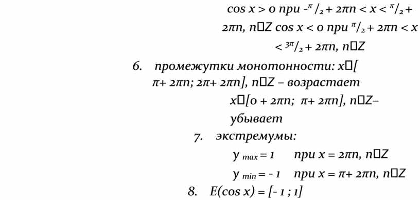 6. промежутки монотонности: x[ π+ 2πn; 2π+ 2πn], nZ – возрастает