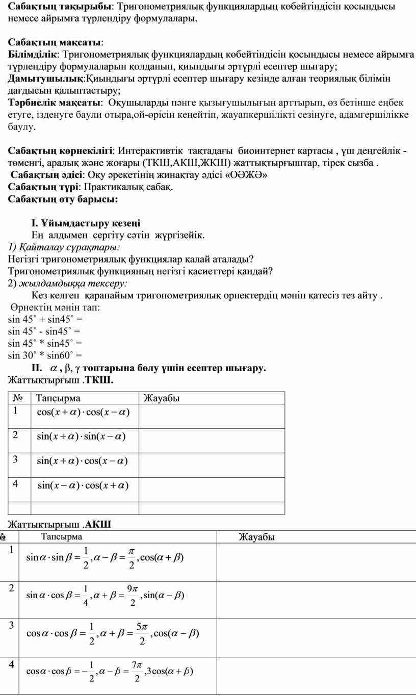 Сабақтың тақырыбы: Тригонометриялық функциялардың көбейтіндісін қосындысы немесе айрымға түрлендіру формулалары.