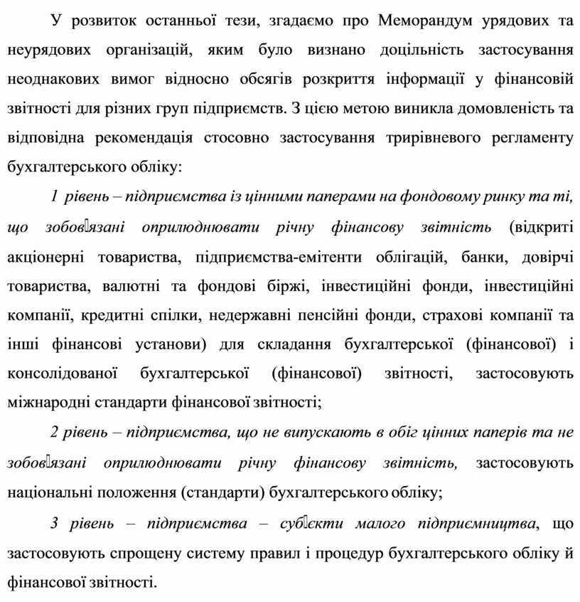 У розвиток останньої тези, згадаємо про Меморандум урядових та неурядових організацій, яким було визнано доцільність застосування неоднакових вимог відносно обсягів розкриття інформації у фінансовій звітності для різних груп підприємств. З цією метою виникла домовленість та відповідна рекомендація стосовно застосування трирівневого регламенту бухгалтерського обліку: