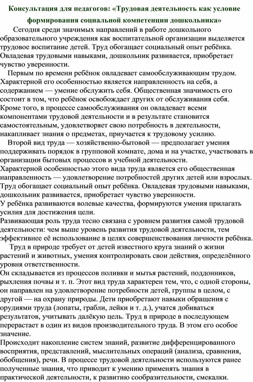 Консультация для педагогов: «Трудовая деятельность как условие формирования социальной компетенции дошкольника» |