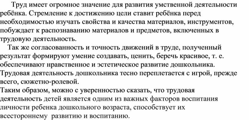Труд имеет огромное значение для развития умственной деятельности ребёнка. Стремление к достижению цели ставит ребёнка перед необходимостью изучать свойства и качества материалов, инструментов, побуждает к распознаванию материалов и предметов, включенных в трудовую деятельность.