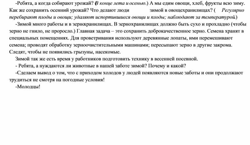 -Ребята, а когда собирают урожай? (В конце лета и осенью.) А мы едим овощи, хлеб, фрукты всю зиму. Как же сохранить осенний урожай? Что делают люди зимой в овощехранилищах? (Регулярно перебирают плоды и овощи; удаляют испортившиеся овощи и плоды; наблюдают за температурой.)