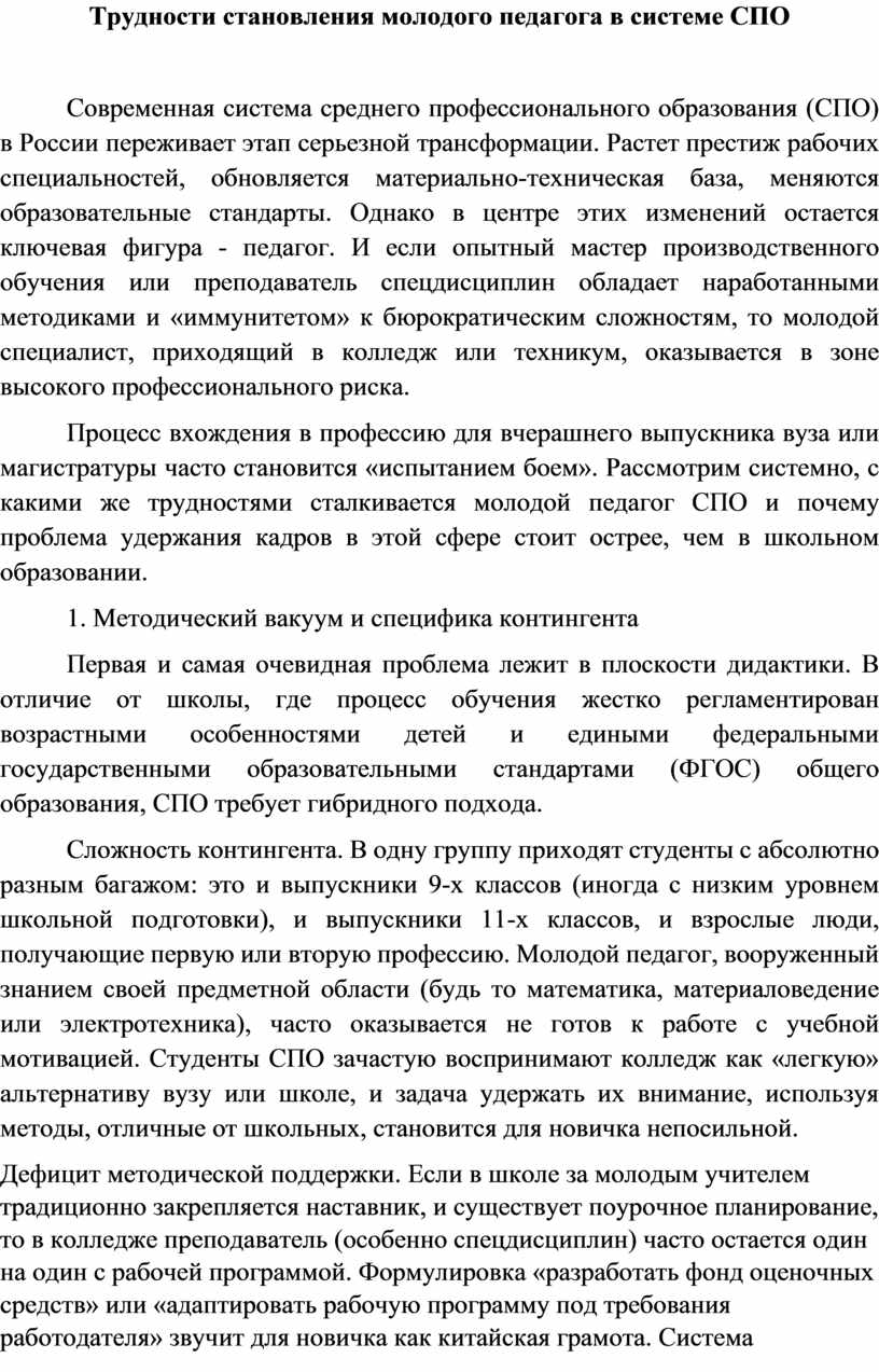 Трудности становления молодого педагога в системе СПО