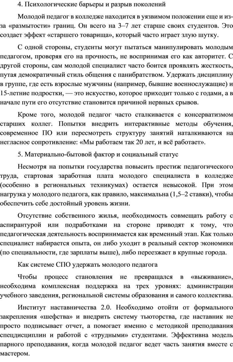 Институт наставничества 2.0. Необходимо отойти от формального закрепления «шефства» и внедрить систему тьюторства, где наставник не просто подписывает отчет, а помогает именно с методикой преподавания спецдисциплин и работой с «трудными» студентами. Эффективна модель парного преподавания, когда молодой педагог ведет часть занятия вместе с мастером.