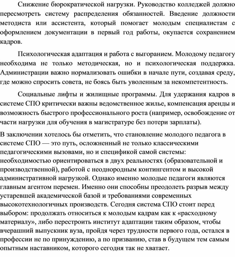 Снижение бюрократической нагрузки. Руководство колледжей должно пересмотреть систему распределения обязанностей. Введение должности методиста или ассистента, который помогает молодым специалистам с оформлением документации в первый год работы, окупается сохранением кадров.
