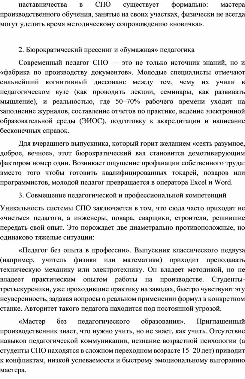 «Мастер без педагогического образования». Приглашенный производственник знает, что нужно учить, но не знает, как учить. Отсутствие навыков педагогической коммуникации, незнание возрастной психологии (а студенты СПО находятся в сложном переходном возрасте 15–20 лет) приводит к конфликтам, низкой успеваемости и быстрому эмоциональному выгоранию мастера.