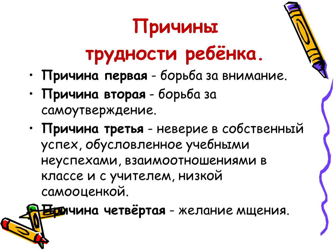 «Трудные» - это обширная категория детей, демонстрирующих отклонение в личностном развитии, нарушение характера и поведения. Трудными обычно называют тех детей, чье поведение резко отклоняется от общепринятых норм и препятствует полноценному воспитанию. В число «трудных» попадают дети неподдающиеся воздействию, неуспевающие и недисциплинированные, школьники, с которыми взрослым трудно работать. Кроме того, сюда относят также детей, поступки которых носят характер правонарушений.