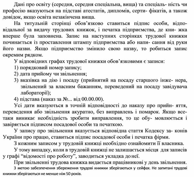 Усі дати вказуються в точній відповідності до наказу про прийн- яття, переведення або звільнення акуратно, без виправлень і помарок. Якщо все-таки виникає необхідність зробити виправлення, то це обу- мовлюється і завіряється підписом посадової особи та печаткою.