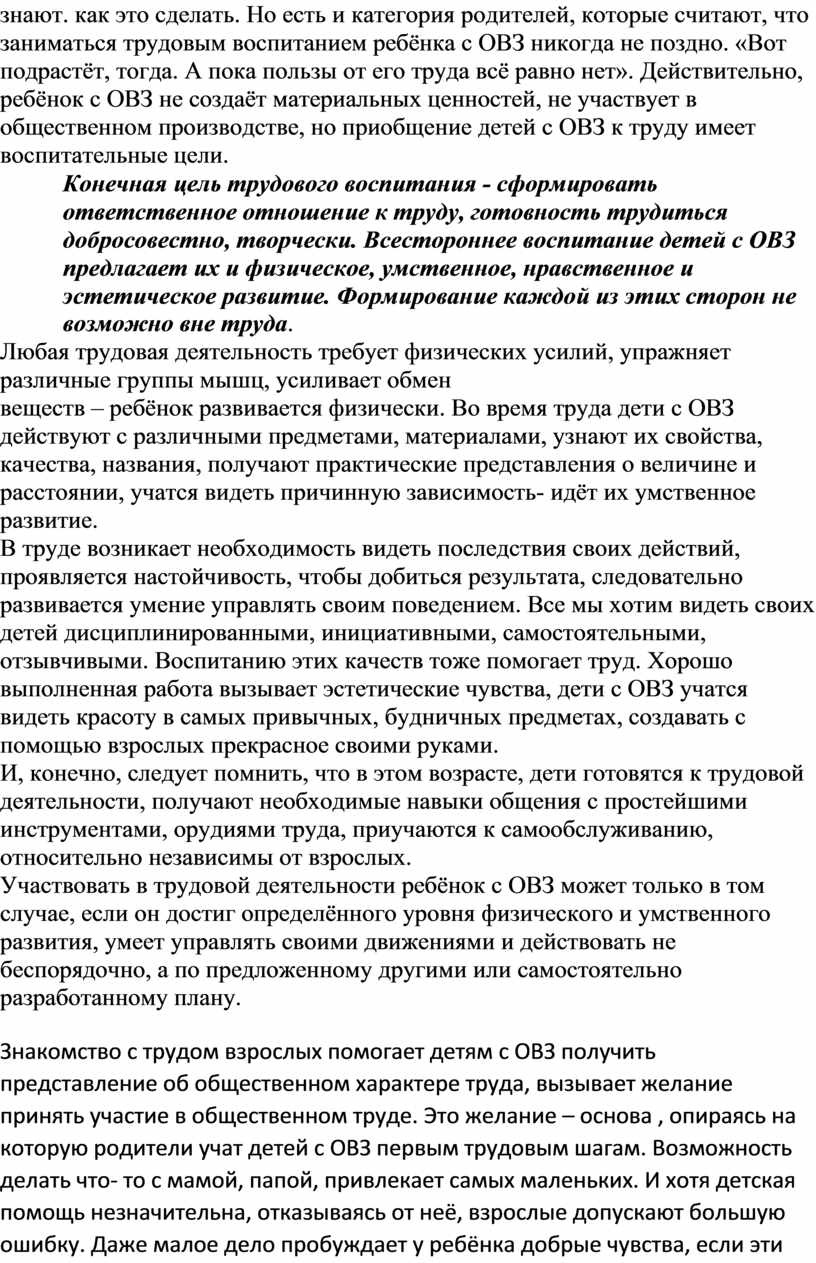 Конечная цель трудового воспитания - сформировать ответственное отношение к труду, готовность трудиться добросовестно, творчески. Всестороннее воспитание детей с ОВЗ предлагает их и физическое, умственное, нравственное и эстетическое развитие. Формирование каждой из этих сторон не возможно вне труда.