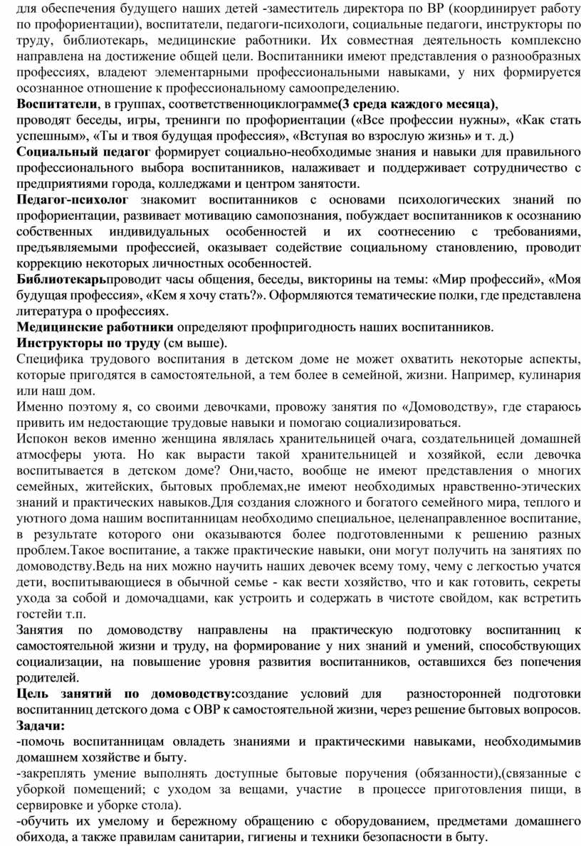 А в нашем детском доме, для успешной профориентации воспитанников задействован ряд специалистов детского дома, которые решают многие проблемы и используют все ресурсы, для обеспечения будущего наших детей -заместитель директора по ВР (координирует работу по профориентации), воспитатели, педагоги-психологи, социальные педагоги, инструкторы по труду, библиотекарь, медицинские работники. Их совместная деятельность комплексно направлена на достижение общей цели. Воспитанники имеют представления о разнообразных профессиях, владеют элементарными профессиональными навыками, у них формируется осознанное отношение к профессиональному самоопределению.