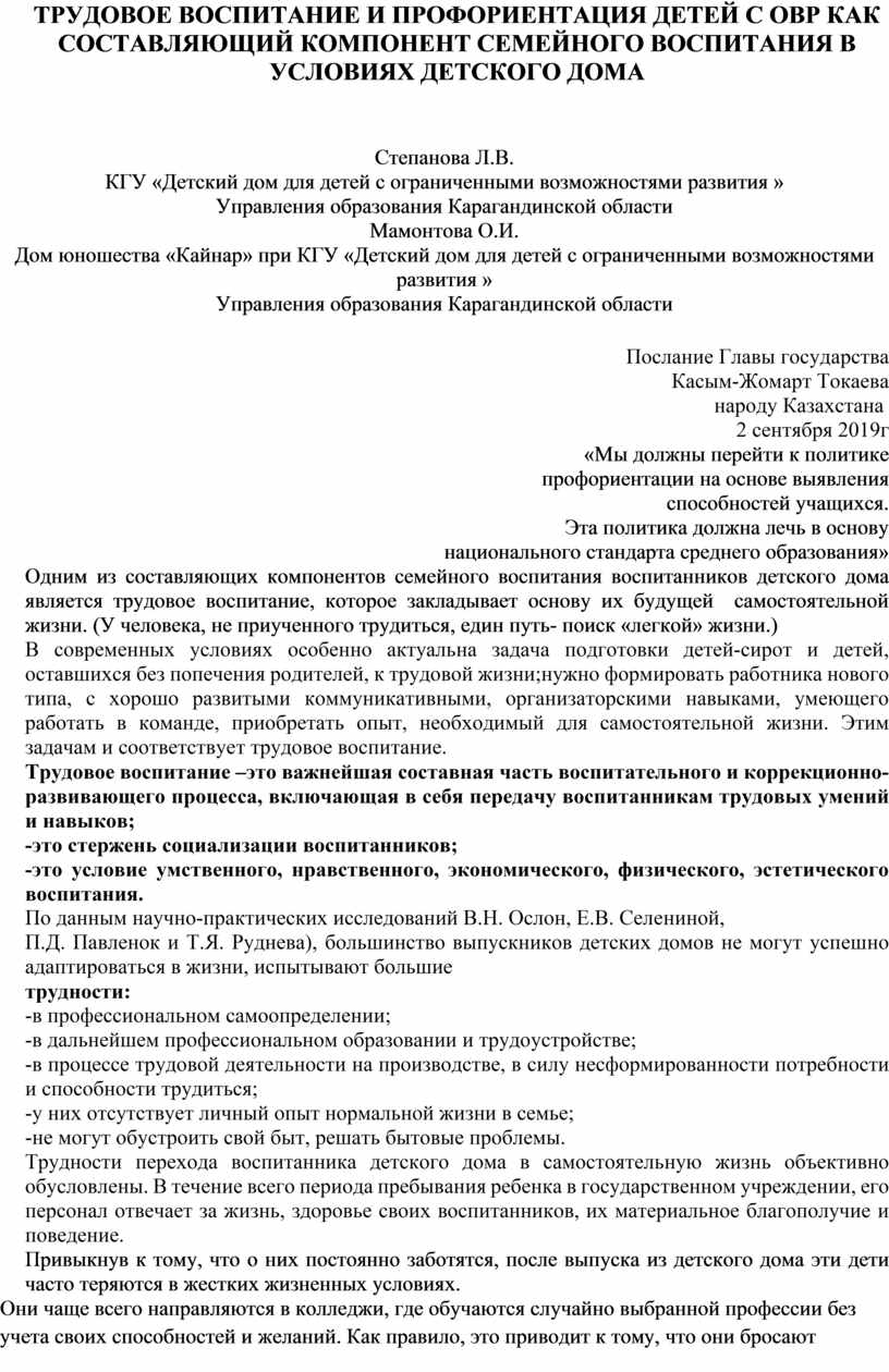ТРУДОВОЕ ВОСПИТАНИЕ И ПРОФОРИЕНТАЦИЯ ДЕТЕЙ С ОВР КАК СОСТАВЛЯЮЩИЙ КОМПОНЕНТ СЕМЕЙНОГО ВОСПИТАНИЯ В УСЛОВИЯХ ДЕТСКОГО ДОМА