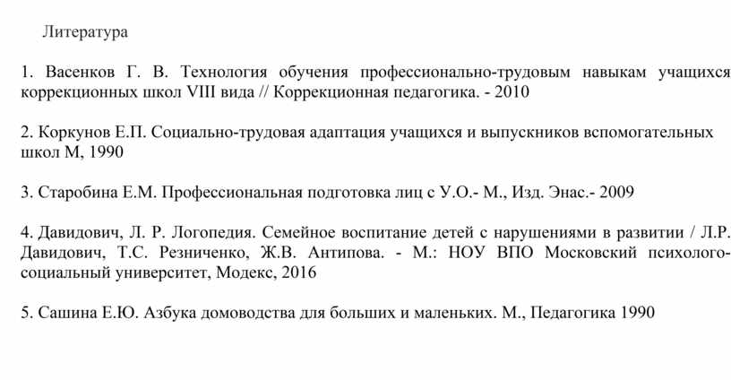 1. Васенков Г. В. Технология обучения профессионально-трудовым навыкам учащихся коррекционных школ VIII вида // Коррекционная педагогика. - 2010
