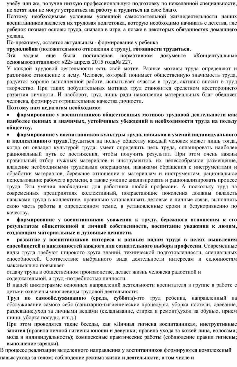 В современных условиях особенно актуальна задача подготовки детей-сирот и детей, оставшихся без попечения родителей, к трудовой жизни;нужно формировать работника нового типа, с хорошо развитыми коммуникативными, организаторскими навыками, умеющего работать в команде, приобретать опыт, необходимый для самостоятельной жизни. Этим задачам и соответствует трудовое воспитание.