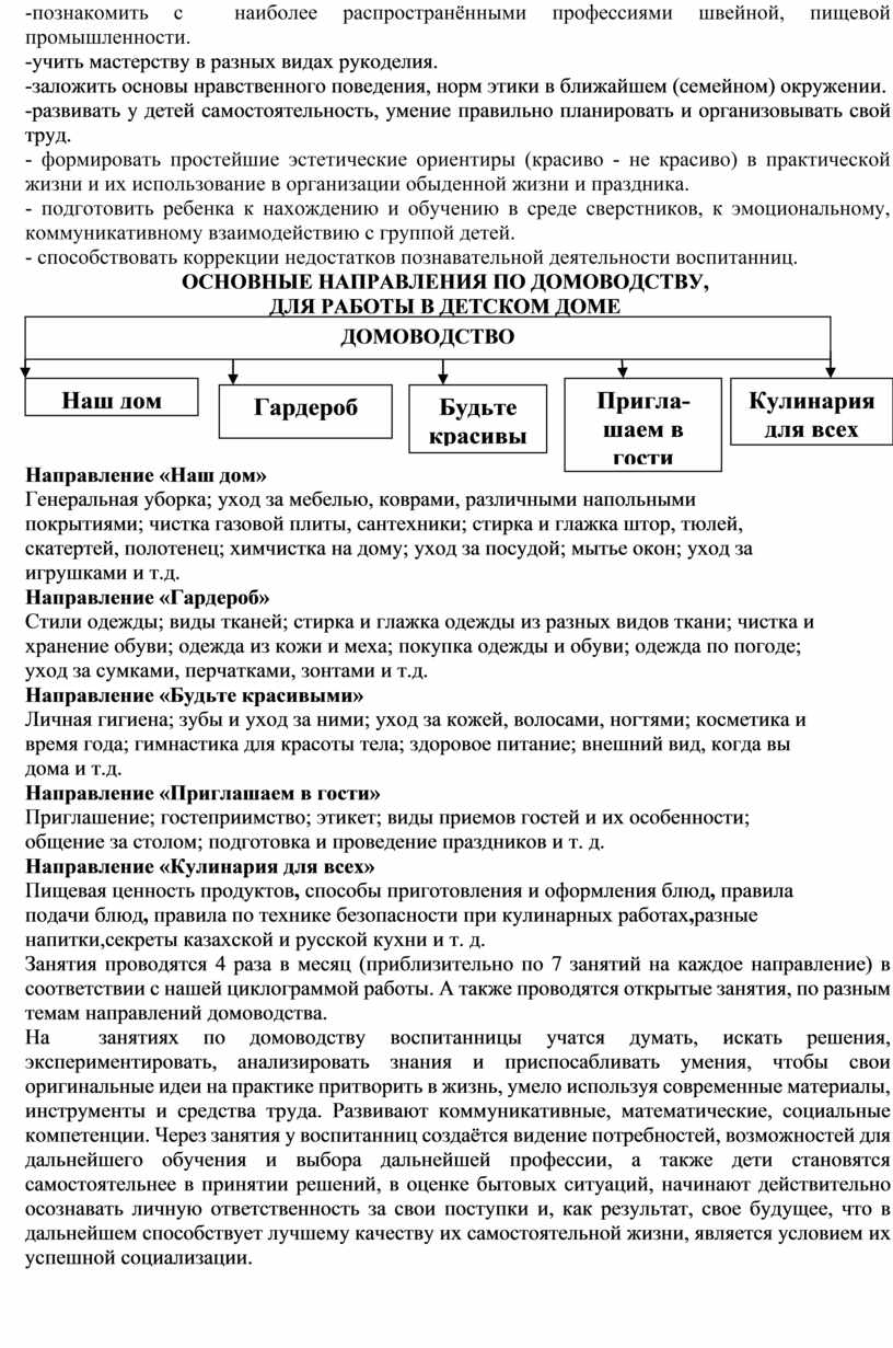 Занятия по домоводству направлены на практическую подготовку воспитанниц к самостоятельной жизни и труду, на формирование у них знаний и умений, способствующих социализации, на повышение уровня развития воспитанников, оставшихся без попечения родителей.