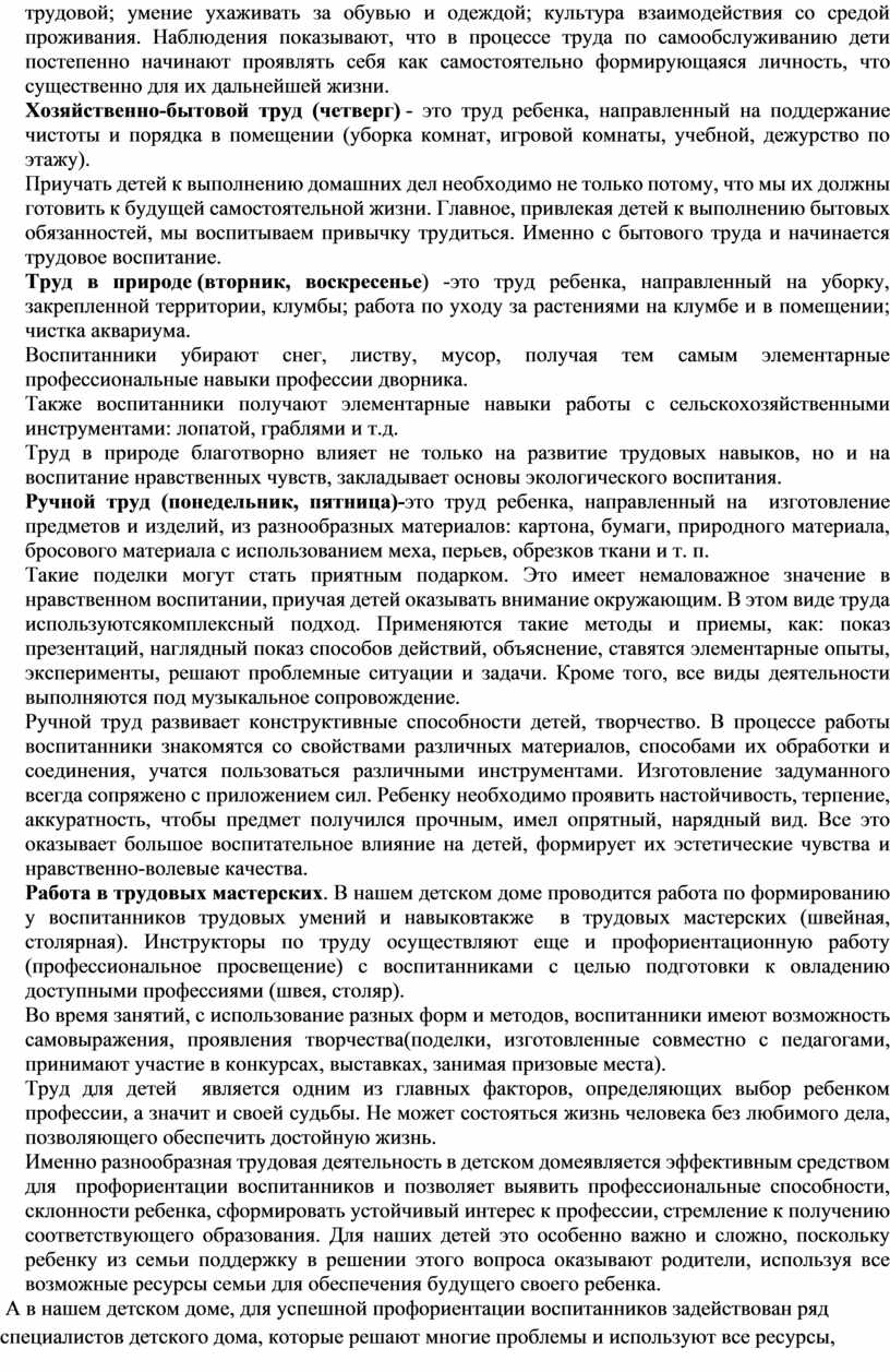 Именно разнообразная трудовая деятельность в детском домеявляется эффективным средством для профориентации воспитанников и позволяет выявить профессиональные способности, склонности ребенка, сформировать устойчивый интерес к профессии, стремление к получению соответствующего образования. Для наших детей это особенно важно и сложно, поскольку ребенку из семьи поддержку в решении этого вопроса оказывают родители, используя все возможные ресурсы семьи для обеспечения будущего своего ребенка.